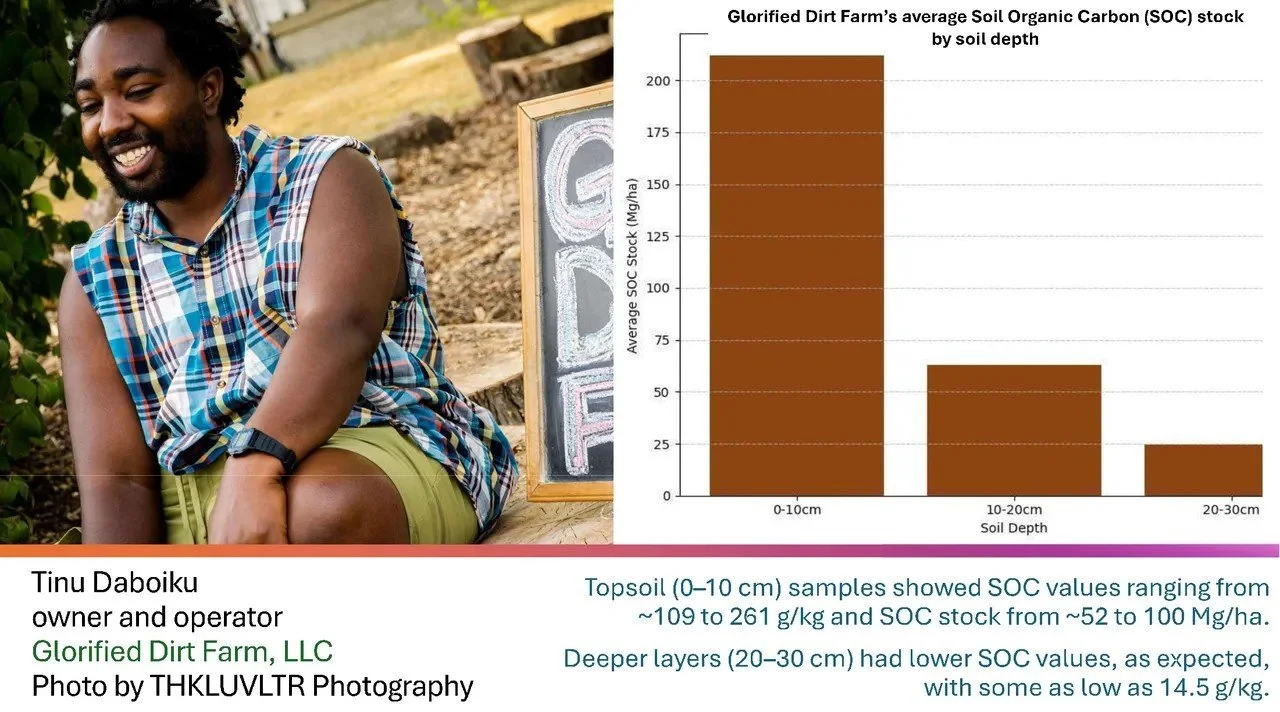 Glorified Dirt has topsoil (found at 0-10cm) that is rich in organic carbon. Having high quantities of organic carbon is great for the health of the soil and sequestering carbon. Deeper layers had lower levels of soil organic carbon, but this is expected.